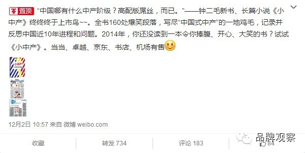 这则微博是这样的:“中国哪有什么中产阶级?高配版屌丝,而已。”——钟二毛新书、长篇小说《小中产》终终终于上市鸟~~。全书160处爆笑段落,写尽“中国式中产”的一地鸡毛,记录并反思中国近10年进程和问题。2014年,你还没读到一本令你捧腹、开心、大笑的书?试试《小中产》。当当、卓越、京东、书店、机场有售。